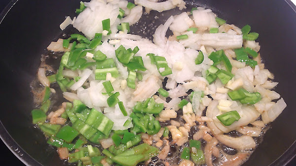 Lo primero es sofreir media cebolla, el pimiento verde y el ajo en un poco de mantequilla. Puedes usar aceite de oliva.