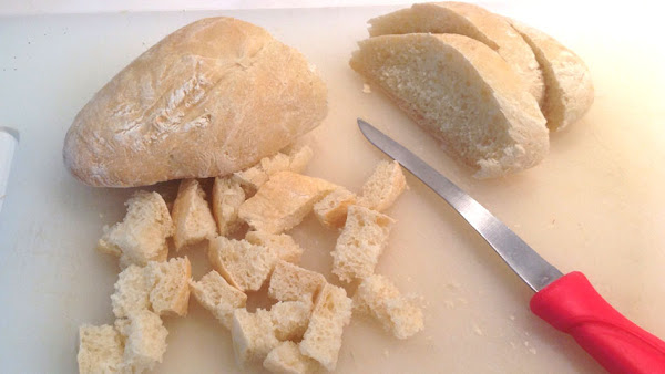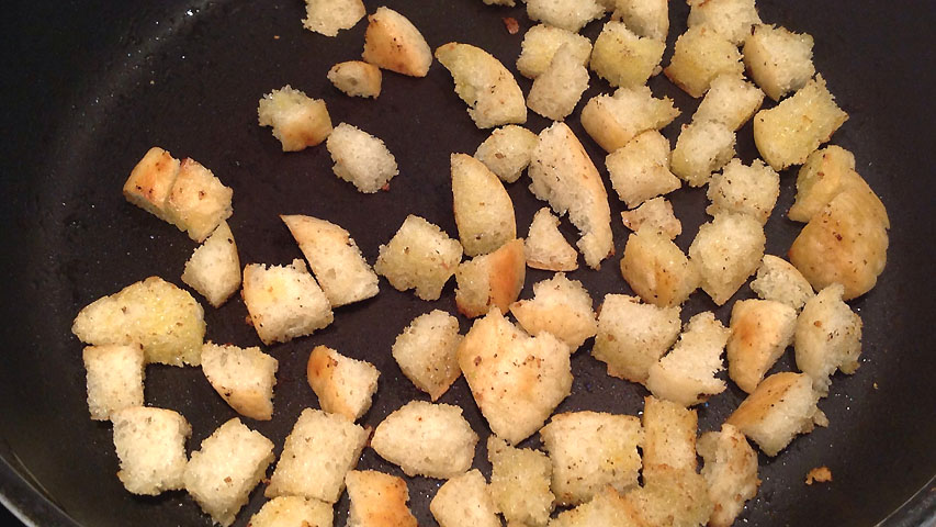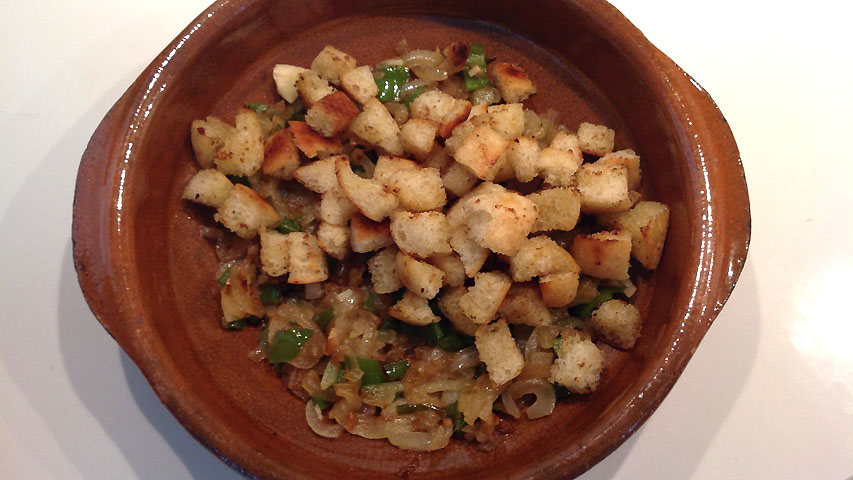 Dora los trozos de pan en la misma sartén del refrito. Puede que necesites añadir algo de más de grasa. Yo he usado aceite de oliva.
