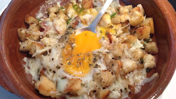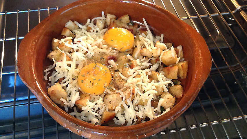 Corta un pan en cubitos y sofríelos en la misma sartén, con la grasa que haya quedado en ella. Si necesitaras algo más de grasa añádela. Puedes poner más mantequilla o usar aceite de oliva. Cuando el pan esté dorado repártelo entre las cazuelas de barro.