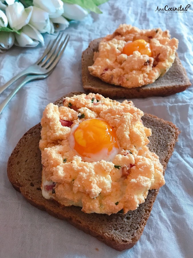 Hoy os traigo mi versión de una receta que esta causando furor en las Redes Sociales. Esta nueva forma de preparar los huevos se ha hecho muy popular debido a su aspecto, ya que simula una nube esponjosa y el sol en su interior, aunque sinceramente, una vez la pruebas te das cuenta de que se ha hecho famosa por lo buena que está, no porque sea bonita (que también lo es...)