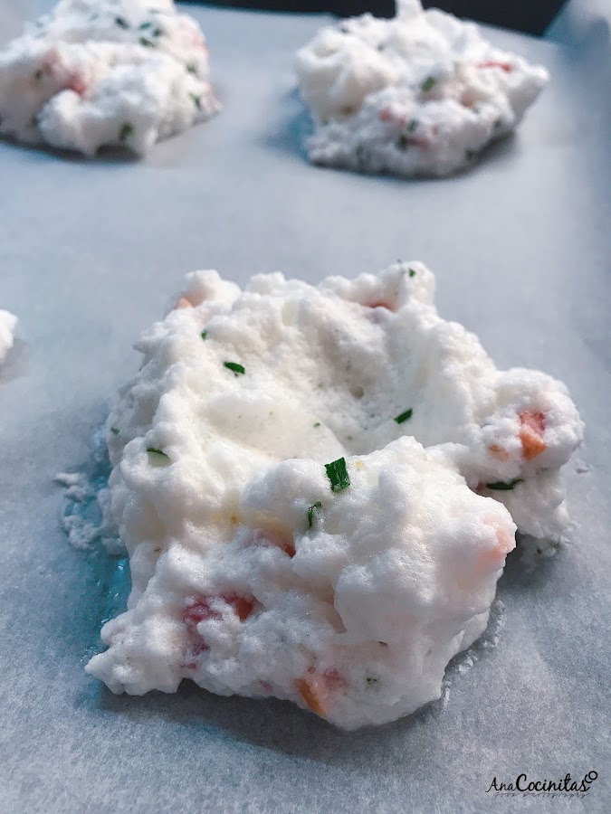 3. Una vez tengamos las claras montadas añadimos la sal, pimienta y ajo en polvo al gusto, el cebollino picado y el bacon y mezclamos con una espátula cuidadosamente hasta tenerlo todo integrado.