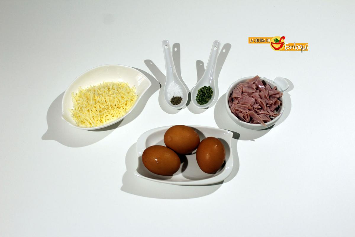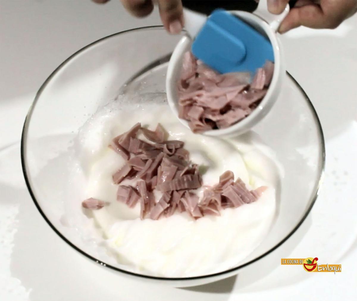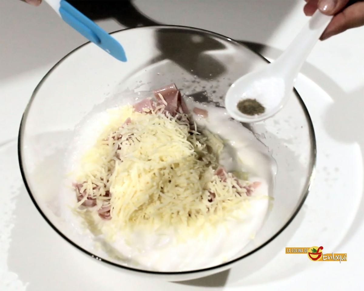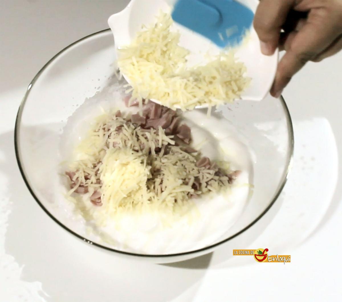 Cuando las claras queden consistentes añade el jamón cocido picadito y el queso rallado. Salpimenta. Mezcla con movimientos envolventes, lentamente. De esta forma los ingredientes quedarán bien integrados en la mezcla y las claras no perderán volumen. Si lo prefieres puedes suprimir el jamón y el queso, pero a nosotros nos gusta bastante el toque que le da en cuanto a su sabor.
