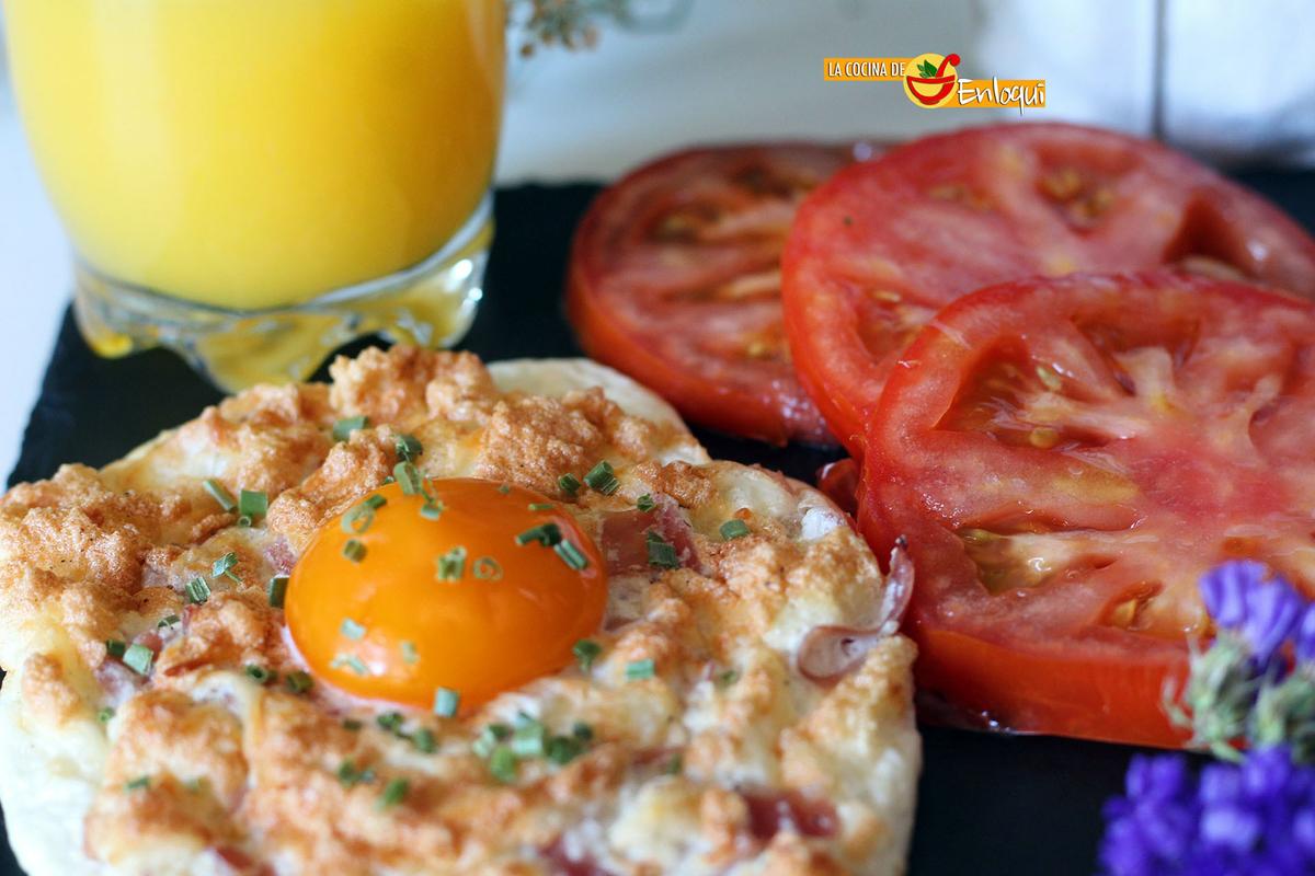 Retira del horno pasado ese tiempo y estará listo para servir. Puedes espolvorear con cebollino aunque este paso es totalmente opcional. Nosotros hemos acompañado con unas rodajas de tomate y un zumo de naranja. De forma que tenemos un desayuno ideal para comenzar el día cargados de energía.
