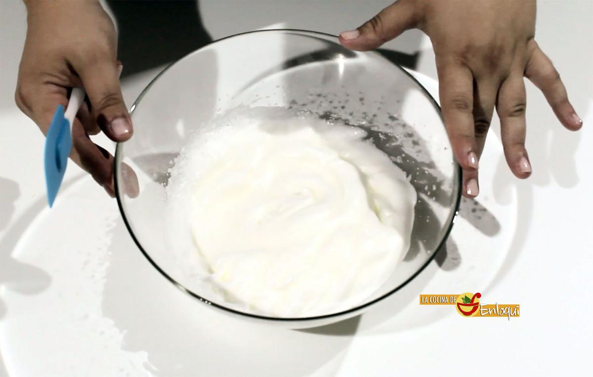Pon las claras en un bol amplio para batir con las varillas eléctricas de forma que nos queden a punto de nieve. Puedes hacerlo con varillas manuales, sólo es cuestión de batir unos minutos más y echarle paciencia.