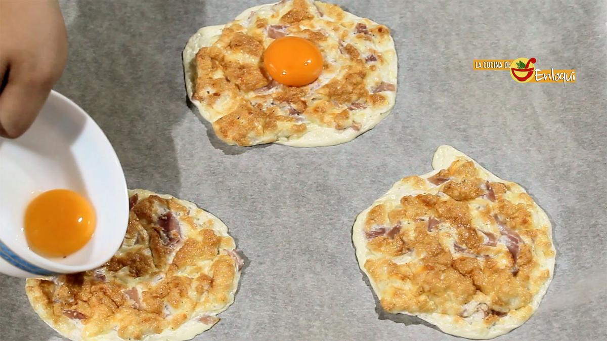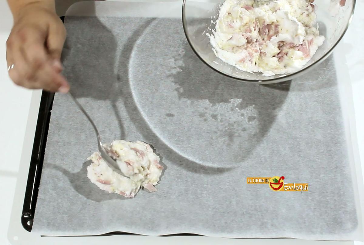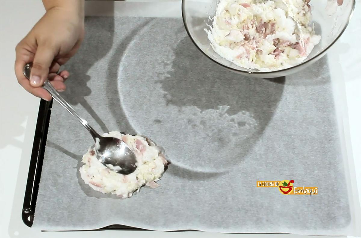 Sobre una bandeja de horno cubierta con papel de hornear coloca la mezcla que has preparado, con la ayuda de una cuchara, en porciones redondas. Ayúdate con la cuchara para hacer un pequeño hueco en el centro ya que después colocarás ahí la yema, pero aún no ha llegado ese momento.