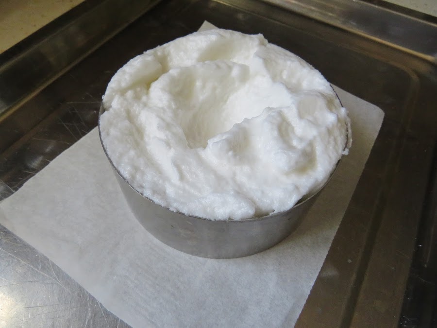 4. Ponemos nuestro "casi" merengue dentro del aro, o lo colocamos lo mejor que podamos en la bandeja, con ayuda de una espátula, haciendo un pequeño hueco en el centro para después poder poner la yema.