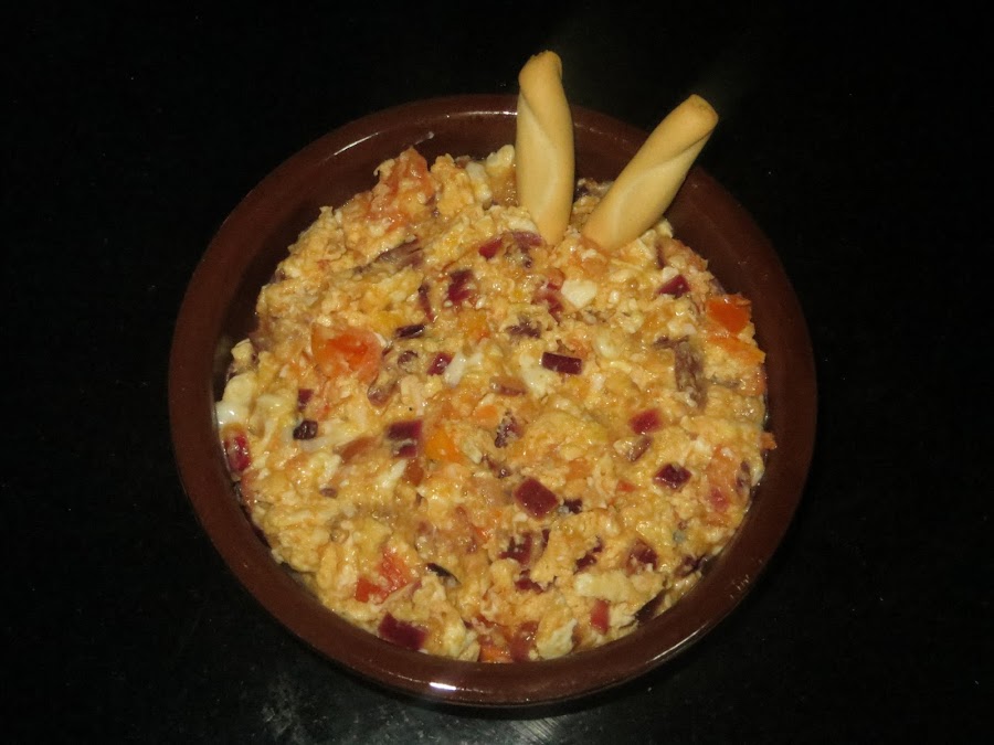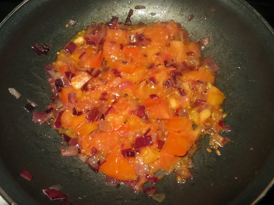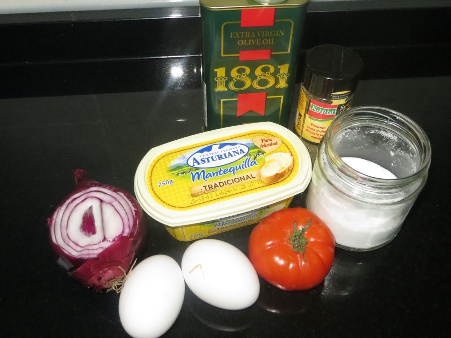 Echamos en una sartén dos cucharadas de mantequilla y la de aceite de oliva, cortamos la cebolla en trozos pequeños y rehogamos hasta que esté bien pochada, entonces añadimos los tomates pelados y cortados en trozos, salpimentamos y pasados cinco minutos, cascamos los huevos en la sartén y le damos varios vueltas durante un par de minutos. Sacamos y ya están listos para comer.