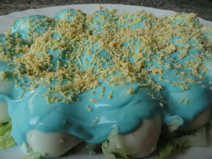 Colorante alimentarioUna vez cocidos los huevos los cortamos por la mitad y le quitamos la yema y las ponemos en un bol. Reservamos algunas para decorar el plato. A las yemas les agregamos el atún, un poco de mayonesa, y lechuga cortada en juliana muy fina, con ello formamos una masa con la que vamos rellenando las mitades de huevo cocido.Ponemos en una bandeja una cama de lechuga cortada en juliana, y sobre ella vamos colocando los huevos boca abajo, y cubrimos con la mayonesa coloreada, La mayonesa yo la preparo de la siguiente forma: en el vaso de la batidora pongo el huevo, sal, vinagre y aceite y pongo la batidora en el fondo y no la muevo. Cuando veo que empieza a subir la mezcla ya con pinta de mayonesa es cuando muevo la batidora arriba y abajo. Se hace en un minuto y puedes aderezarla a tu gusto, en este caso lleva media cucharadita de colorante en gel Dr. Oecker. Las yemas que teníamos reservadas las rallamos sobre los huevos.