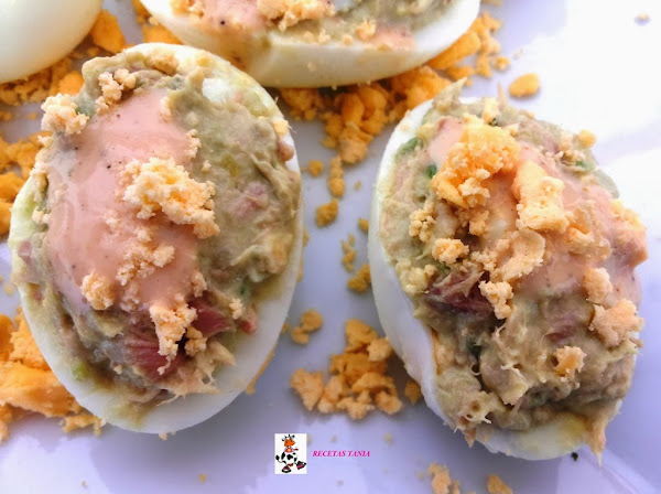 Ponemos un caldero con agua al fuego y cuando empiece a hervir añadimos los huevos y dejamos al fuego unos 15min. Luego los pelamos, partimos por la mitad,sacamos la yema, la picamos y añadimos a un bol, junto con el atún y el aguacate triturado. Añadimos mayonesa y mezclamos bien hasta que tengamos una masa. Rellenamos los huevos y por encima ponemos un poquito de salsa rosa y yema de huevo picada. Metemos en la nevera y cuando estén fresquitos a comer... Ricos,Ricos,Ricos :D