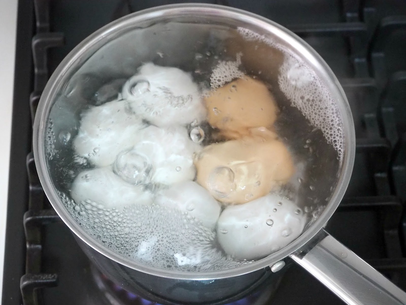 - Ponemos a cocer los huevos en agua. Queremos que las yemas estén bien hechas, así que los dejamos unos 10-12 minutos. Pasado el tiempo los pasamos por el chorro de agua fría para cortar la cocción y los dejamos enfriar.