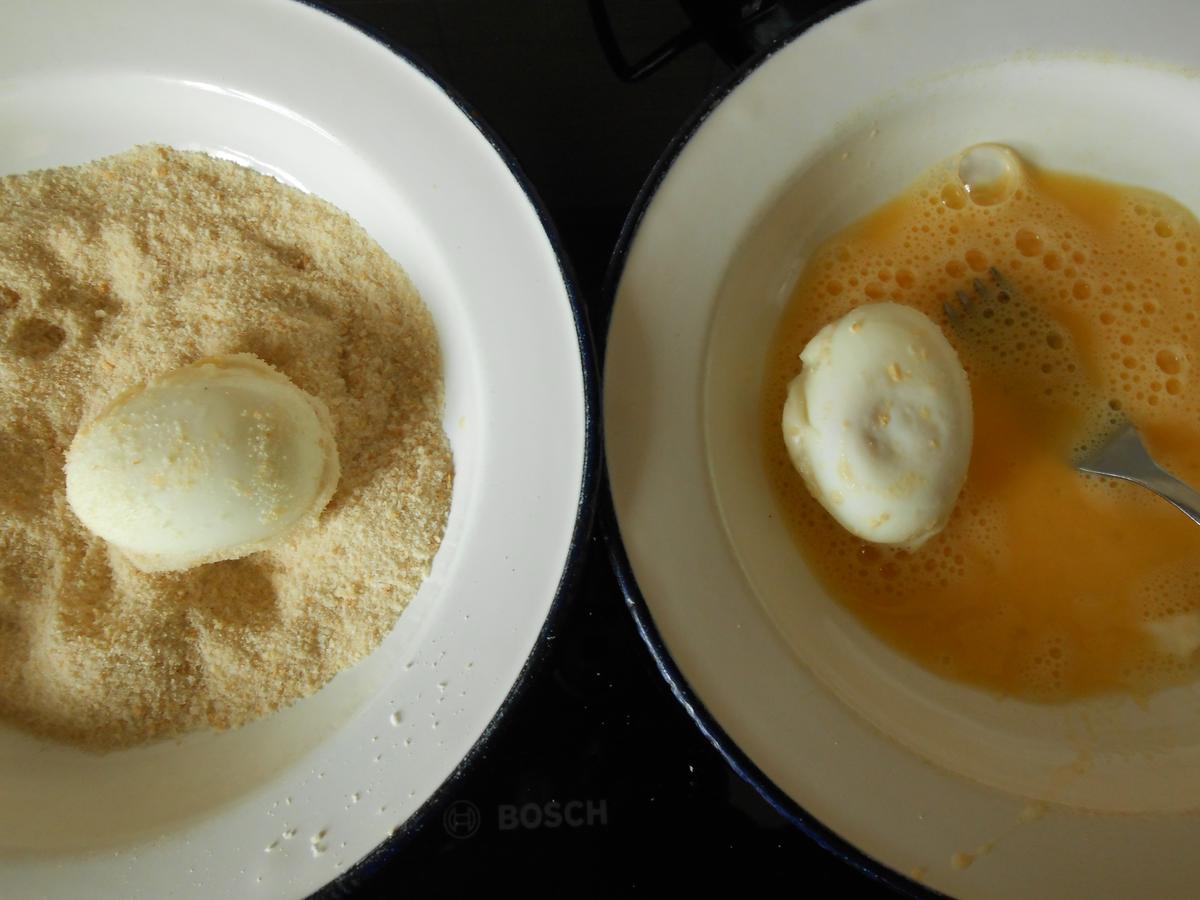 Pasar sólo la parte de la bechamel por huevo batido y pan rallado.
