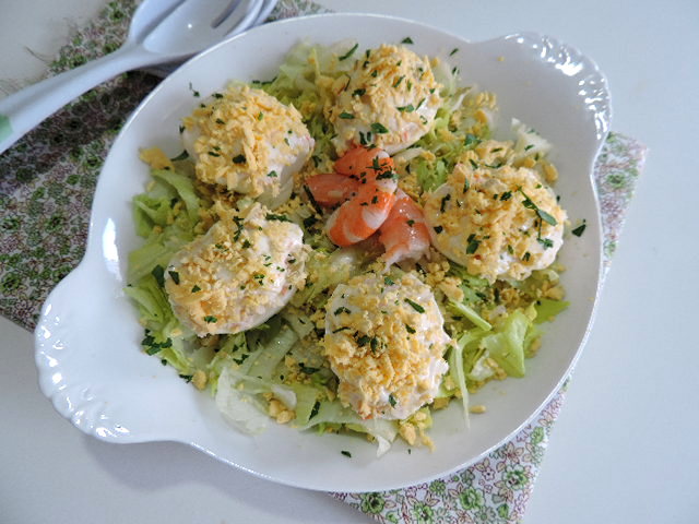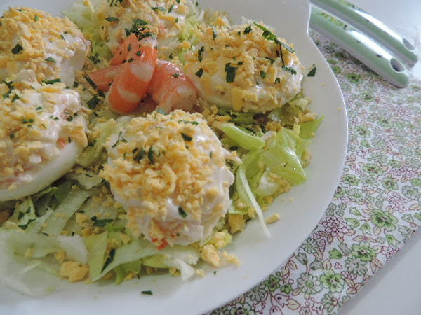 En bol rallamos las yemas restantes,troceamos los palitos de cangrejo y los langostinos.Todo los más fino posible.