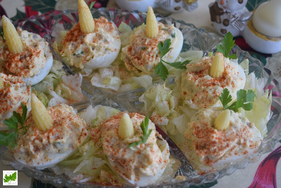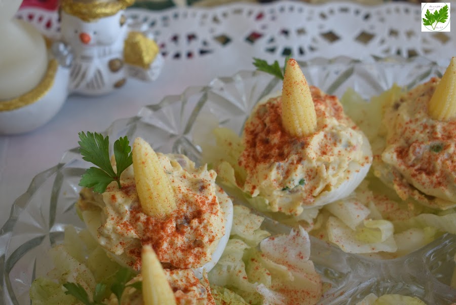 Decora con unas hojitas de perejil fresco y la punta de la mazorquita. Espolvorea pimentón dulce por encima.