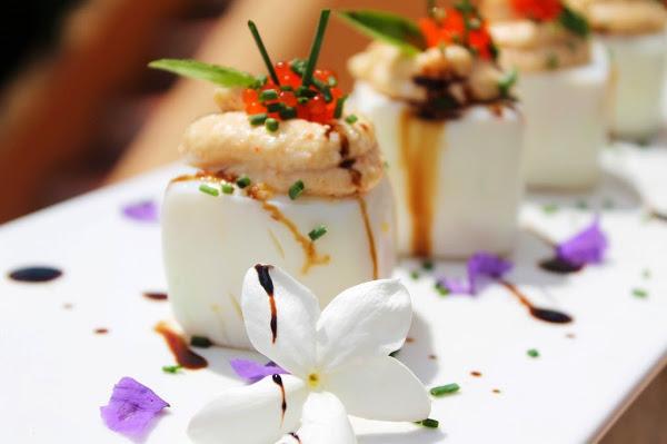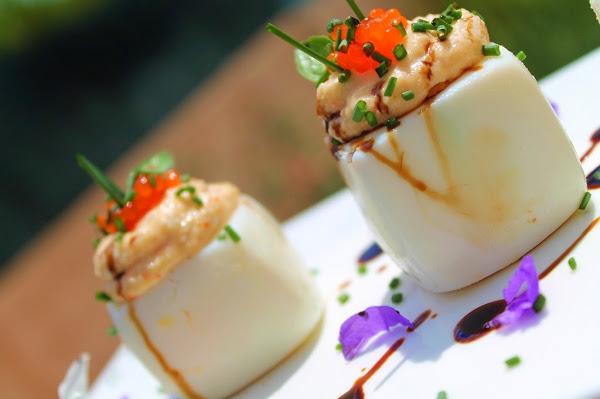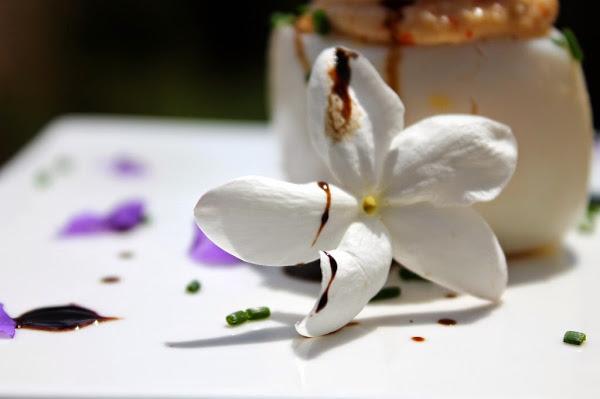 Decorar con las huevas de salmón, el cebollino picado, los pétalos y las hojitas de albahaca.
