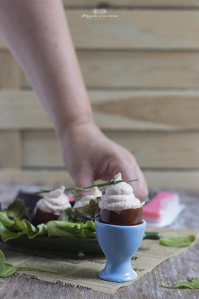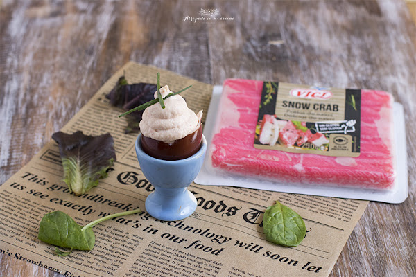 Una vez pasado este tiempo sacamos y dejamos secar completamente (el vinagre podéis guardarlo para otra ocasión). Cortamos la parte de arriba de cada huevo y sacamos las yemas. Y luego preparamos el relleno, para ello trituramos las gambas cocidas, el Snow Crab o Surimi, una yema cocida de uno de los huevos el atún junto con la mayonesa, hasta conseguir una mezcla homogénea. Introducimos en una manga pastelera y rellenamos el huevo. Decoramos con unos tallos de cebollino fresco.