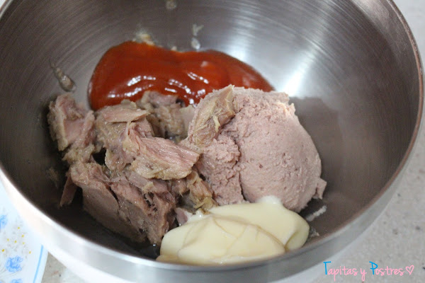 Preparamos la mezcla de atún, paté, tomate frito, mayonesa y yemas.