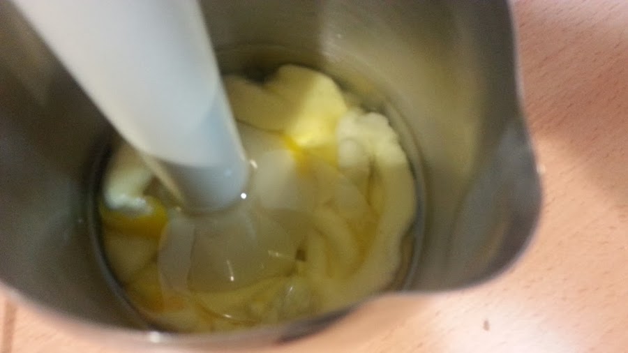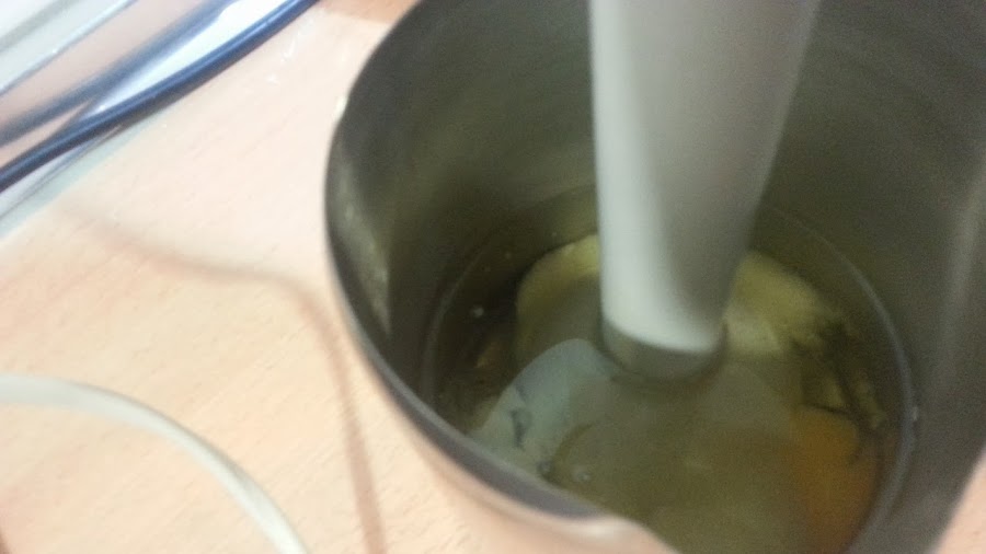 la batidora sigue en el fondo sin moverse y ya veréis como se forma la mahonesa y desaparece el aceite, cuando eso pase, ya podéis subir hacia arriba y abajo la batidora e incluso si queréis subir un poco la velocidad