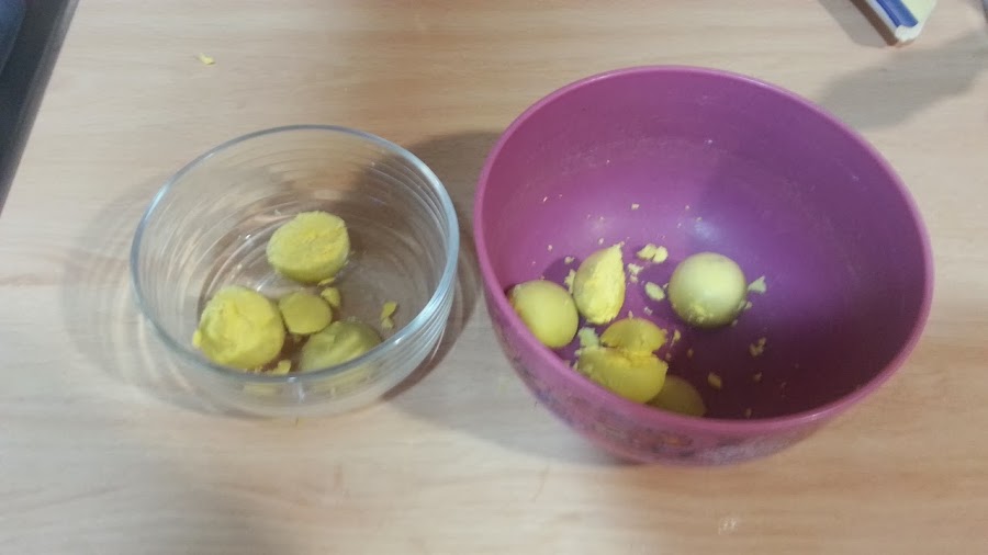 en un bol dejamos yema y media para decorar al final y en el otro el resto