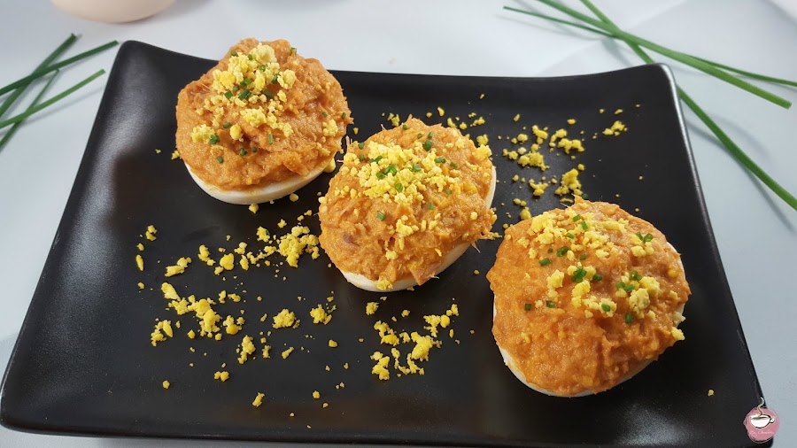 Con ayuda de una cuchara vamos rellenando los huevos. Espolvoreamos con la yema desmenuzada que habíamos dejado reservada y con cebollino picado.