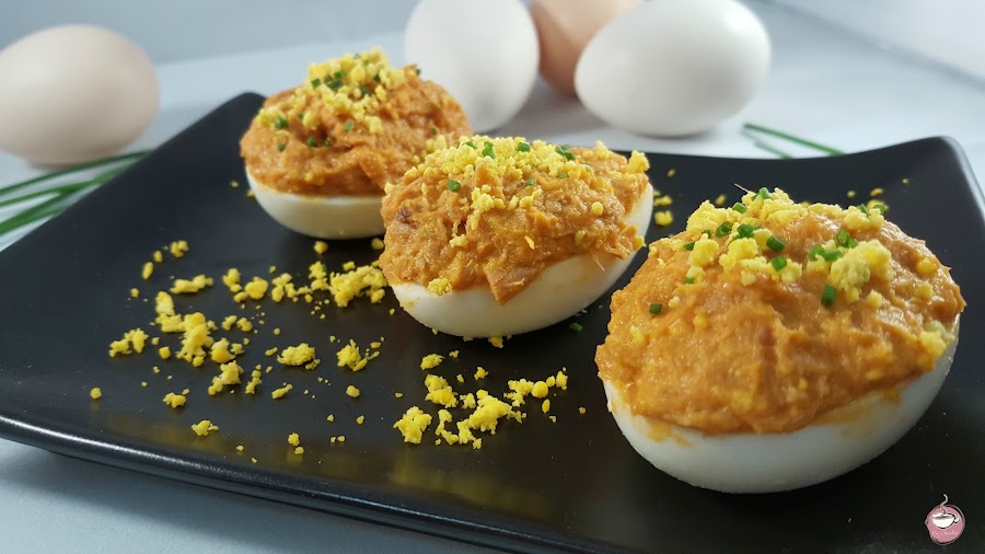 Cocemos los huevos. Los dejamos enfriar y los pelamos. Los partimos por la mitad longitudinalmente y sacamos las yemas. Reservamos.