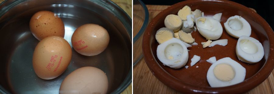 Lo primero para preparar estos huevos rellenos de carne gratinados, pondremos un cazo con agua y los huevos, los coceremos durante 10 minutos. Cuando estén dejamos enfriar los huevos, los cortamos por la mitad, sacamos las yemas.