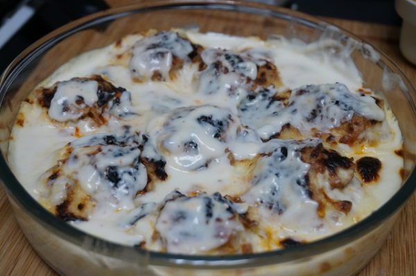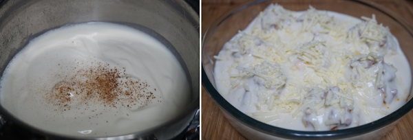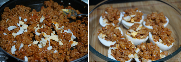 Preparamos una bechamel, RECETA AQUI. Cubrimos la fuente de los huevos rellenos con la bechamel, cubrimos con queso rallado, metemos al horno a 180ºC con gratinador hasta que queden dorados los huevos.