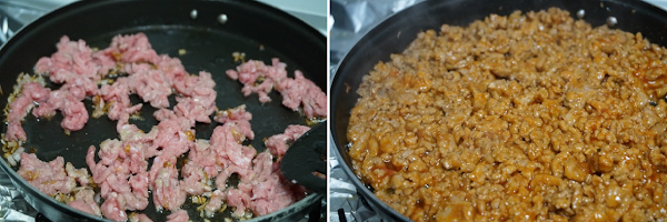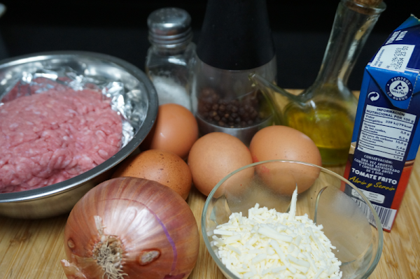 Por otro lado preparamos la carne. Picamos la cebolla, ponemos una sartén con un buen chorro de aceite, cuando est´s caliente añadimos la cebolla, cuando empiece a tomar color añadimos la carne. La cocinamos hasta que coja todo color, añadimos sal y pimienta. removemos y vamos añadiendo tomate frito hasta dejarlo a nuestro gusto de sabor. Lo cocinamos todo junto 10 minutos.