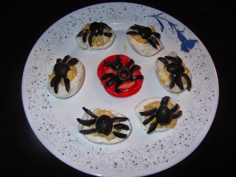 Por otro lado, pelamos los huevos y les quitamos la yema, que añadimos al bol de la ensaladilla. Ahora aliñamos la ensaladilla con la mayonesa y vamos rellenado los huevos. Una vez que habéis rellenado los huevos ya sólo queda decorarlos, cogéis una aceituna negra la partís por la mitad y la colocáis encima de los huevos, con la otra mitad de la aceituna realizáis las patas de la araña y ya están listos para comer.