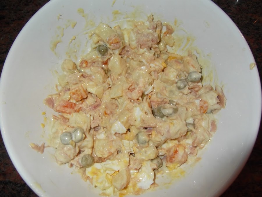 Una vez que tenemos todo cocido vamos a comenzar a realizar la ensaldilla, pelamos las patatas y la zanahoria, las partimos en cachos pequeños y echamos el conjunto en un plato hondo. En éste añadimos la lata de atún bien escurrida y el bote de guisantes y reservamos.