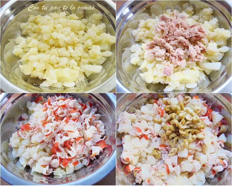 1. Cocer la patata con su piel, dejar enfriar y pelar. Cortar en daditos un poco más pequeños que si hiciéramos una clásica ensaladilla rusa. Salar ligeramente.