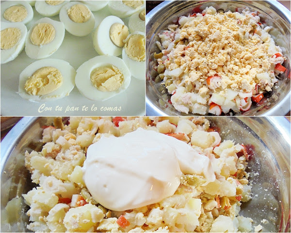 4. Partir los huevos por la mitad a lo largo, sacar las yemas y reservar una de ellas para la decoración final. El resto chafarlas con un tenedor y añadirlas a la ensaladilla.