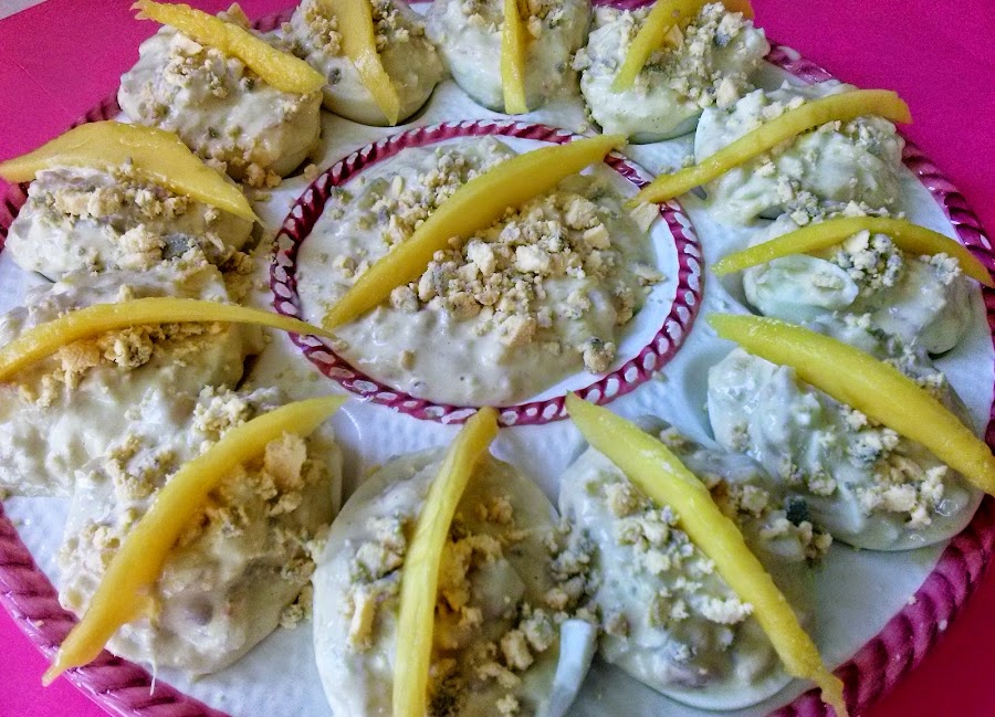 El mango picado agrégalo a las yemas y gambas. Mezcla todo con una cucharadas de mahonesa .