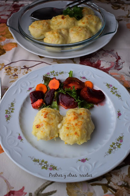 Con ayuda de cucharas, rellenamos y cubrimos las claras cocidas reservadas con la mezcla. Ponemos los huevos rellenos en un recipiente de hornear, cubrimos con el resto de la bechamel, espolvoreamos con el queso de gratinar rallado y gratinamos a 200ºC unos 10 minutos. Servimos.