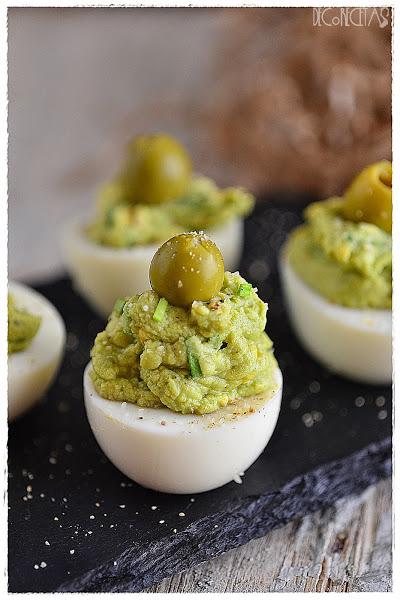Para el relleno como habréis leído en el título, utilicé guacamole casero, la propia yema cocida del huevo, ajetes frescos y cebolla picada. Para culminar una aceituna que siempre le da el punto a unos huevos rellenos cualquiera