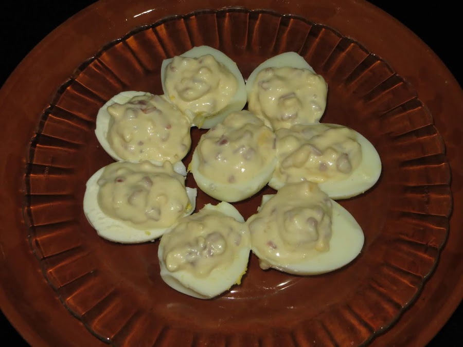 Luego cortáis los huevos por la mitad y separáis la clara de la yema, la yema se la añadís a la mezcla anterior y rellenáis los huevos. Los dejáis en la nevera hasta la hora de servir y ya tenéis listo vuestro plato.
