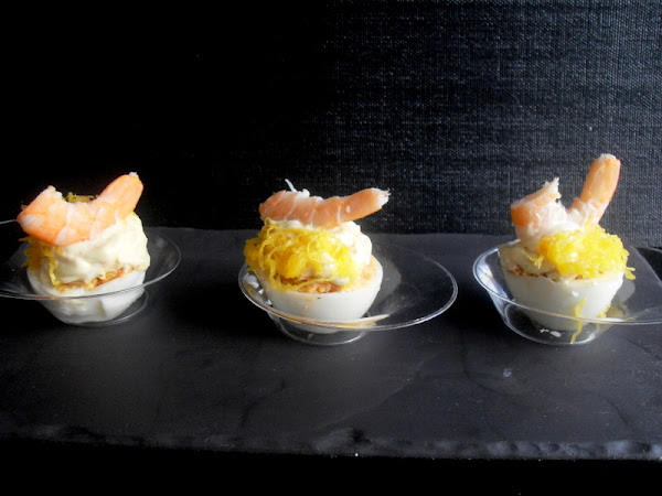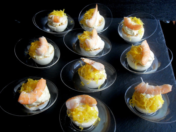 Rellenar sobresaliendo del huevo, como una pequeña montaña, cubrir con la mayonesa-mostaza, decorar con la cola de langostino y rallar las yemas reservadas por encima.
