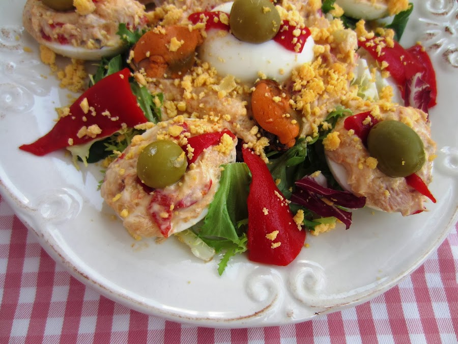 Unimos todo y rellenamos las claras con esta mezcla. Limpiamos la lechuga y la cortamos en juliana, ponemos sobre una fuente un lecho de lechuga en juliana y encima colocamos los huevos rellenos, adornamos con las aceitunas, algunos pimientos troceados y los mejillones reservados. y Rallamos la yema que tenemos reservada por encima. Servimos frío.