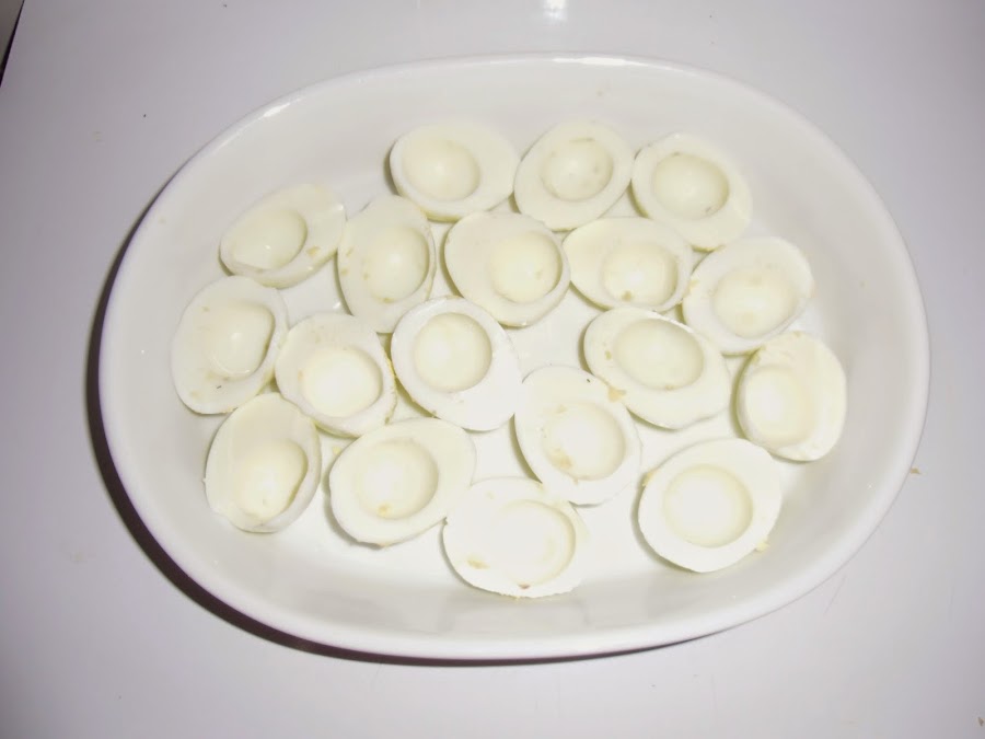 Ahora los cortamos por la mitad longitudinalmente y colocamos las claras en una fuente adecuada