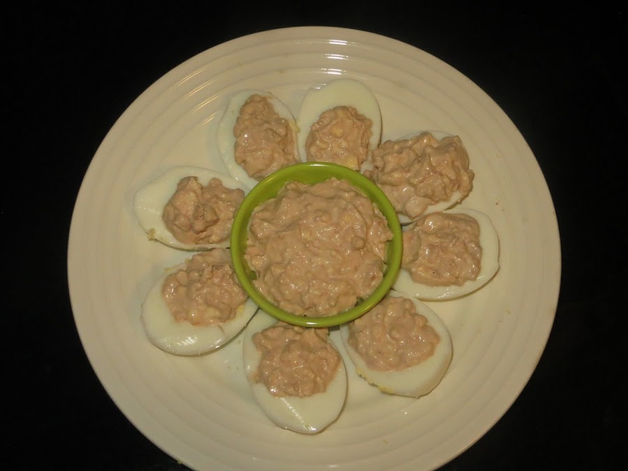 Echáis la yema a un bol junto con la lata de pate y sobre una taza de mayonesa, si es casera mucho mejor: http://lacucharaenlamaleta.blogspot.com.es/2013/01/queso-de-huerta-y-mar.html. Lo mezcláis todo y luego rellenáis los huevos, los metéis a la nevera hasta el momento de servirlos y ya tenéis preparados vuestros huevos rellenos.
