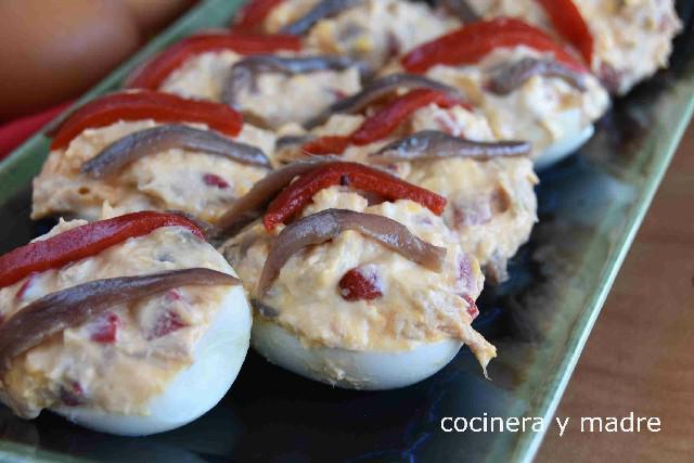 Dificultad: muy fácil Raciones: 8 unidades Tiempo: 15 minutosIngredientes de los huevos rellenos de pimientos y anchoas: