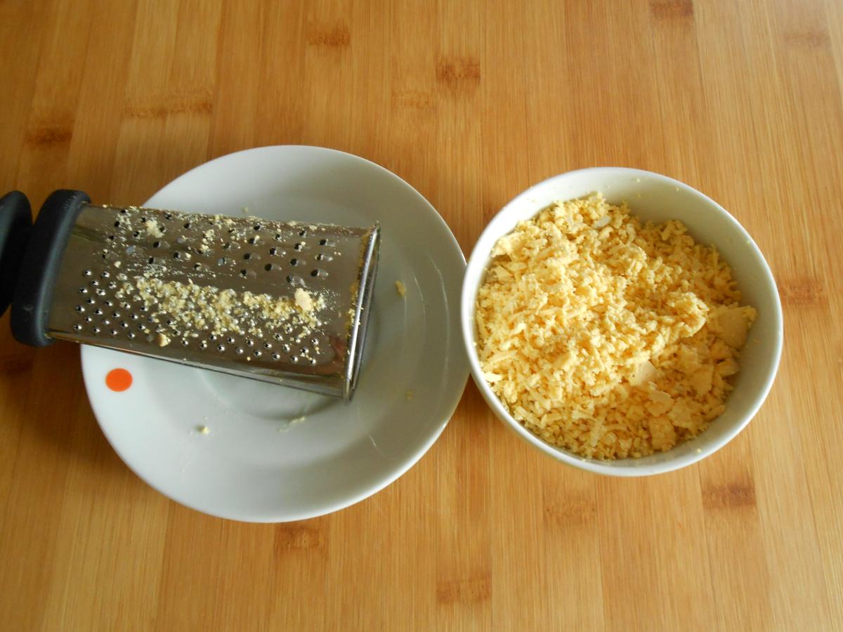 Cortar por la mitad, quitar la yema y rallarla, después la pondremos al servirlos, también se puede envolver con el pisto cuando esté cocinado y rellenar con esa mezcla los huevos.