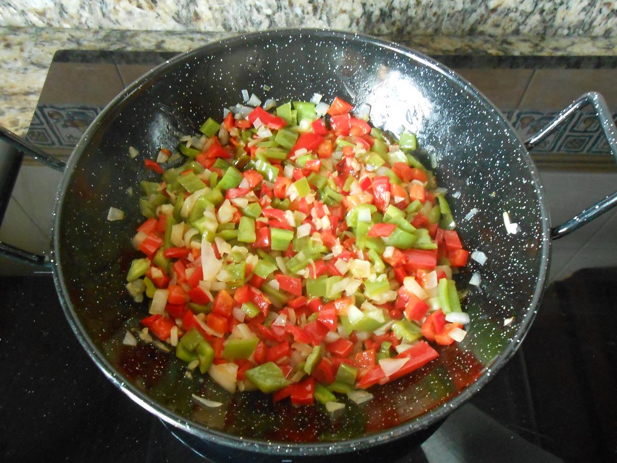 Echar el aceite en una sartén, cuando esté caliente echar las verduras y bajar a fuego medio hasta que se cocinen bien, cuando quiera sobresalir el aceite de las verduras el sofrito estará en su punto.