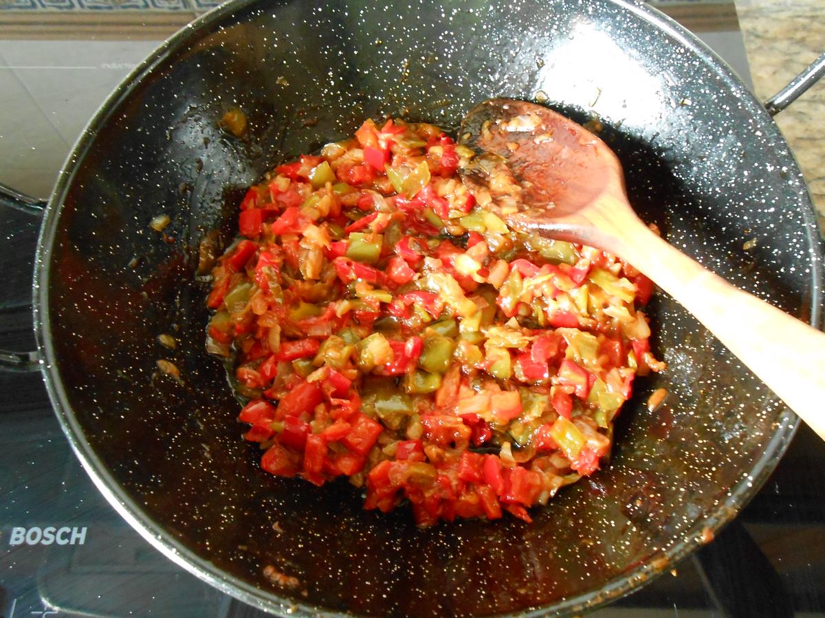 Lavar, quitar las semillas a los pimientos y partir a trocitos pequeños.