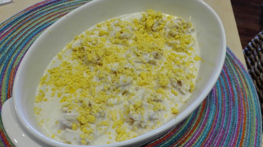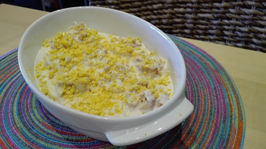 - Enfriar los huevos, cortarlos longitudinalmente, quitar la yema (reservarla) y rellenarlos con el pollo, que habremos deshecho un poco con las manos.