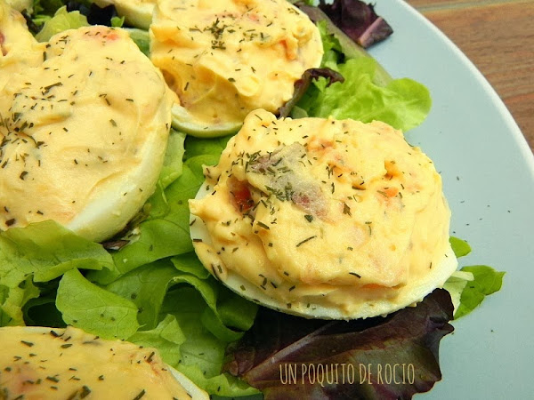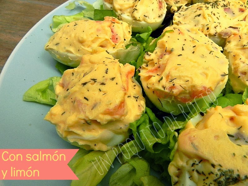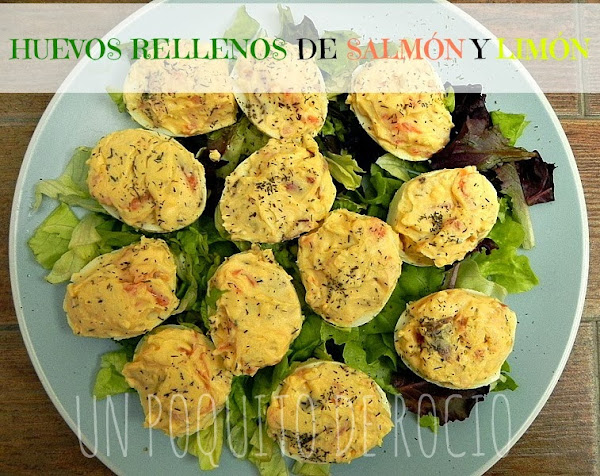 Necesitamos 6 huevos cocidos. Los cortamos por la mitad a lo largo, les sacamos las yemas y las ponemos en un bol. Machacamos un poco con un tenedor y le añadimo una cucharada de mayonesa, mezclamos. Ahora le ponemos unos 50 g de salmón ahumado cortado a trocitos pequeños, volvemos a mezclar y por último le agregamos la ralladura de medio limón y un poquito de eneldo picado.