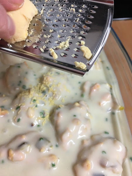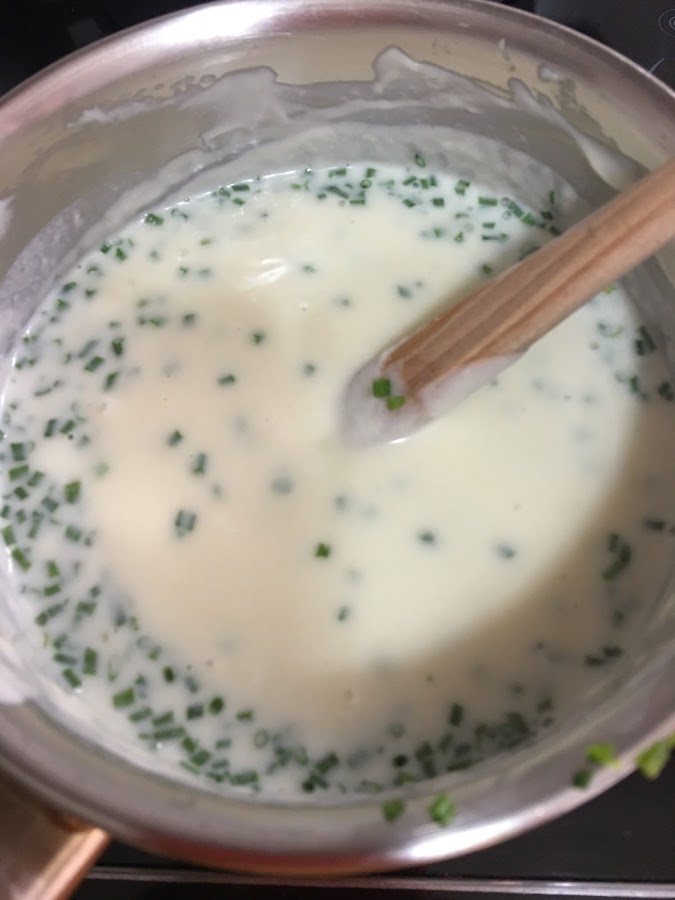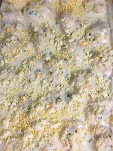 Se añade el cebollino picado muy fino y se remueve bien. Se "napan" o cubren los huevos con la bechamel y se rallan las yemas reservadas encima de ellos.