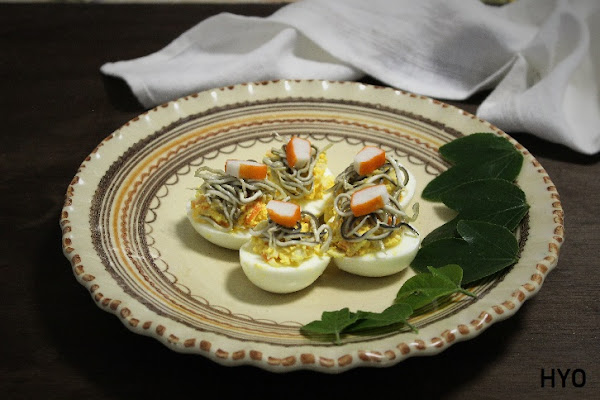 Están rellenos de surimi y coronados con angulas sucedáneas salteadas. Tienen el punto justo de mayonesa para no tapar el sabor de los demás ingredientes (ya sabes, menos es más), y por supuesto, no son unos huevos cualquiera... Son huevos de gallinas felices, que saben y sientan mejor.