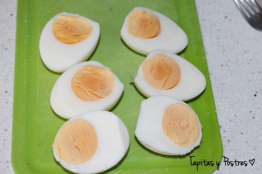 Cocemos los huevos en abundante agua durante unos 10 o 12 minutos. Dejamos enfriar y pelamos y cortamos por la mitad a lo largo.