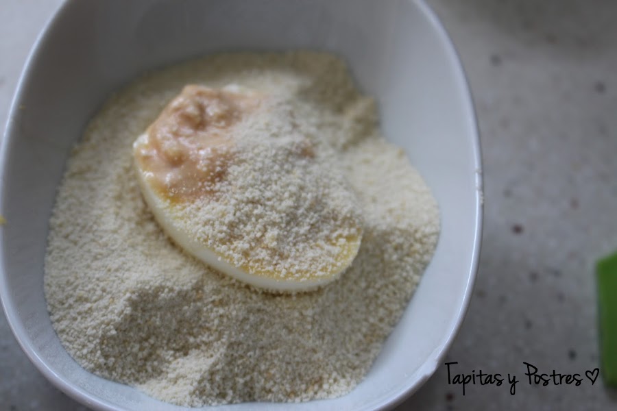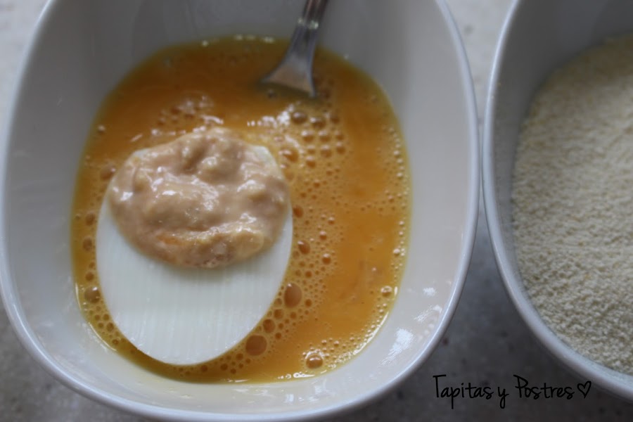 haremos un doble rebozado, pasamos los huevos rellenos por pan rallado, huevo batido y de nuevo pan rallado.