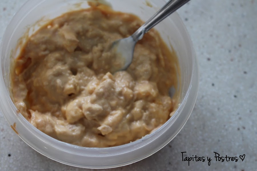 Sacamos las yemas y mezclamos con la mayonesa, el atun y el tomate.